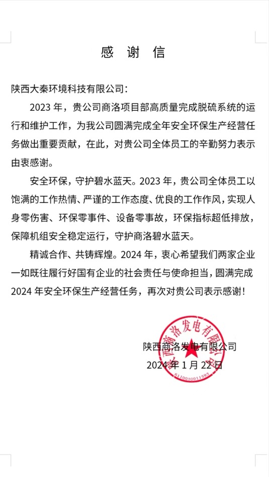 近日,大秦公司收到陜投集團商洛發(fā)電公司感謝信,來信充分肯定大秦商洛項目公司在2023年高質(zhì)量完成脫硫系統(tǒng)的運行和維護工作,為商洛發(fā)電公司圓滿完成全年安全環(huán)保生產(chǎn)經(jīng)營任務(wù)作出了重要貢獻。同時,商洛項目公司榮獲商洛發(fā)電公司2023年度“安全先進集體”榮譽。